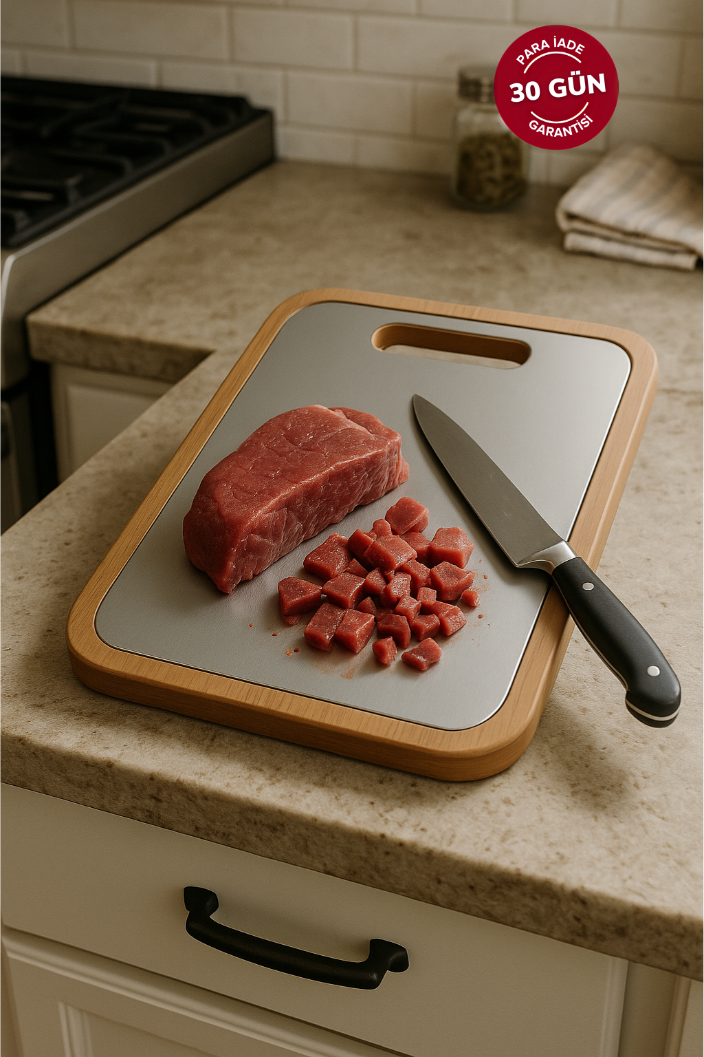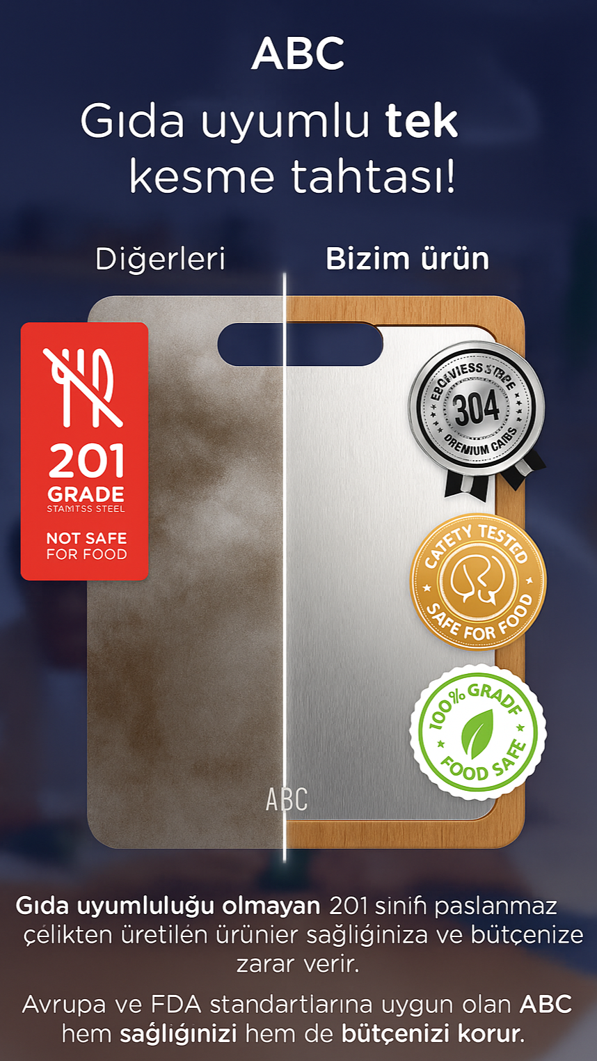 Piyasadaki ucuz kesme tahtaları çoğunlukla düşük kalite çelikten üretilir. Fera™ Bufolo ise FDA onaylı, gıda uyumlu 304 kalite paslanmaz çelikle üretilmiştir. Sağlığınız ve güvenliğiniz için en iyisini seçin.