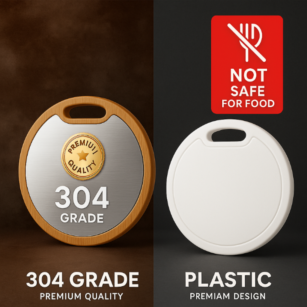 Piyasadaki ucuz kesme tahtaları çoğunlukla düşük kalite çelikten üretilir. Fera™ Venüs ise FDA onaylı, gıda uyumlu 304 kalite paslanmaz çelikle üretilmiştir. Sağlığınız ve güvenliğiniz için en iyisini seçin.